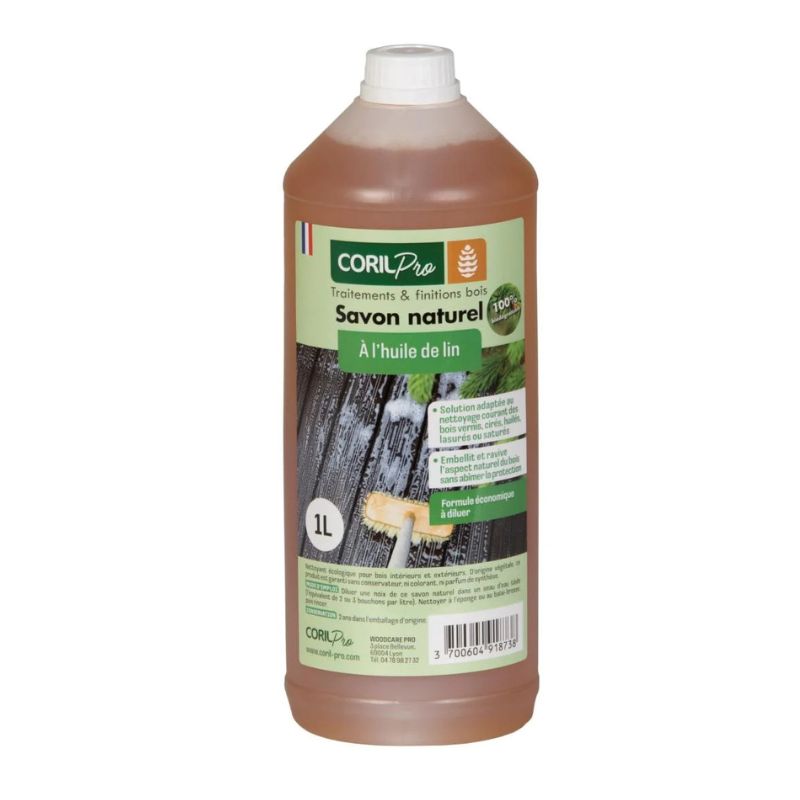 Le Savon Naturel est un nettoyant écologique à l’huile de lin, spécialement conçu pour l’entretien courant des bois intérieurs et extérieurs. Il nettoie, ravive et respecte les protections existantes.